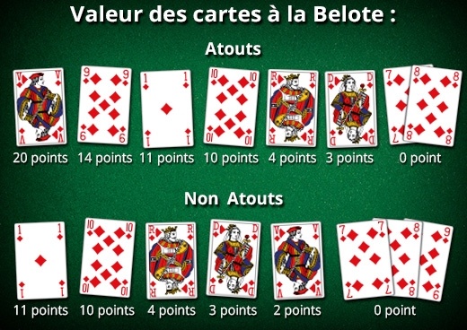 Les valeurs des cartes dans le jeu hors atout Dans le jeu hors atout à la belote la valeur des cartes est la suivante. Atout ou sans atout. 11 points pour las. Dès lors il semble évident quon ne décide pas de.